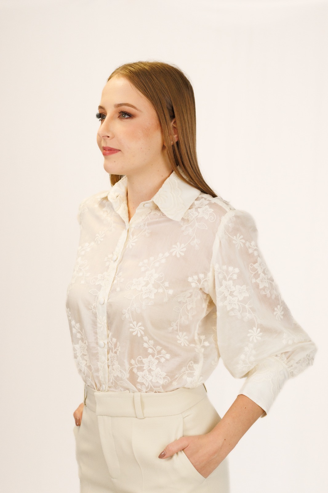 Camisa social de modelagem tradicional com mangas bufantes, punho largo com três botões e abertura frontal com seis botões forrados. Confeccionada em organza bordada com flores, traz leveza, romantismo e sofisticação ao visual.